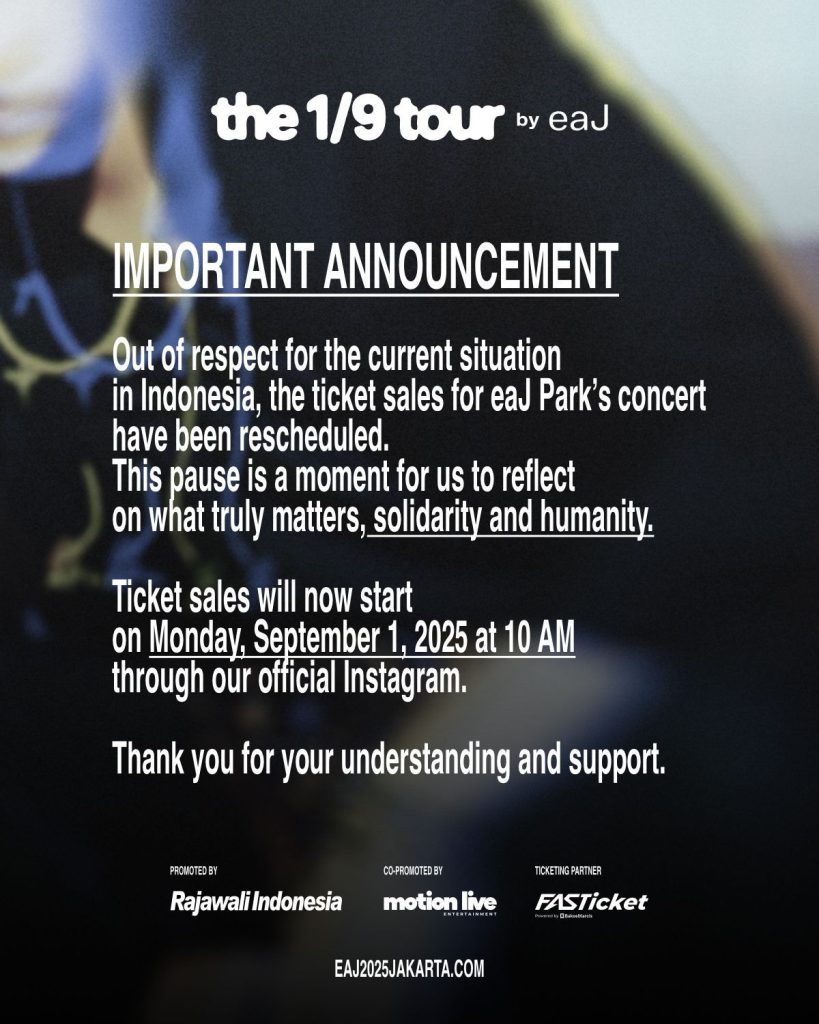 Our hearts are with everyone affected by the current situation in Indonesia. Out of respect for our country and its people, we have decided to postpone today’s ticket sales for The 1/9 Tour by eaJ.